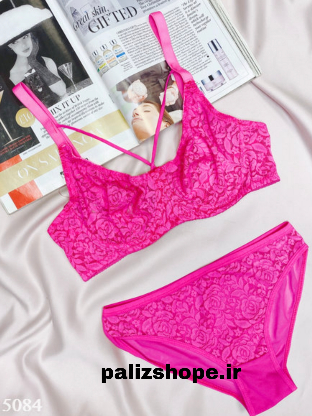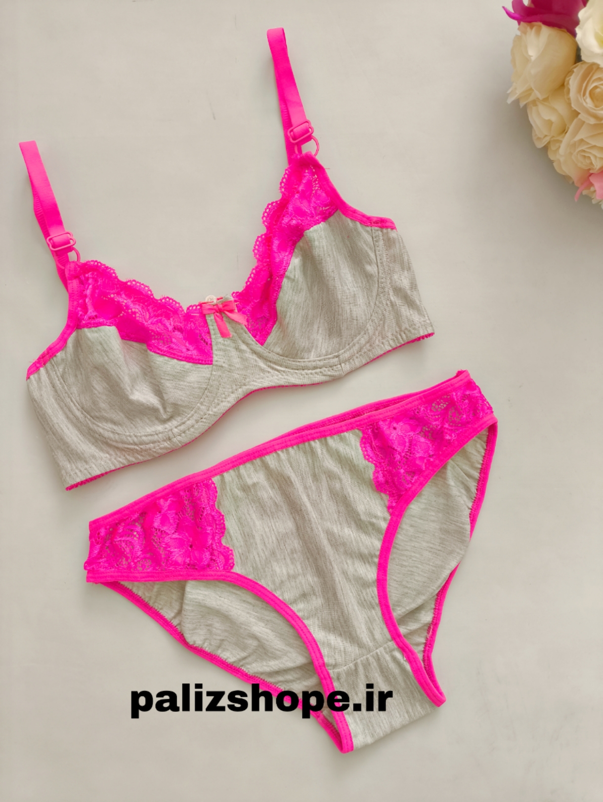 ست لباس زیر فانتزی گیپوری طرح گل رنگ سرخابی